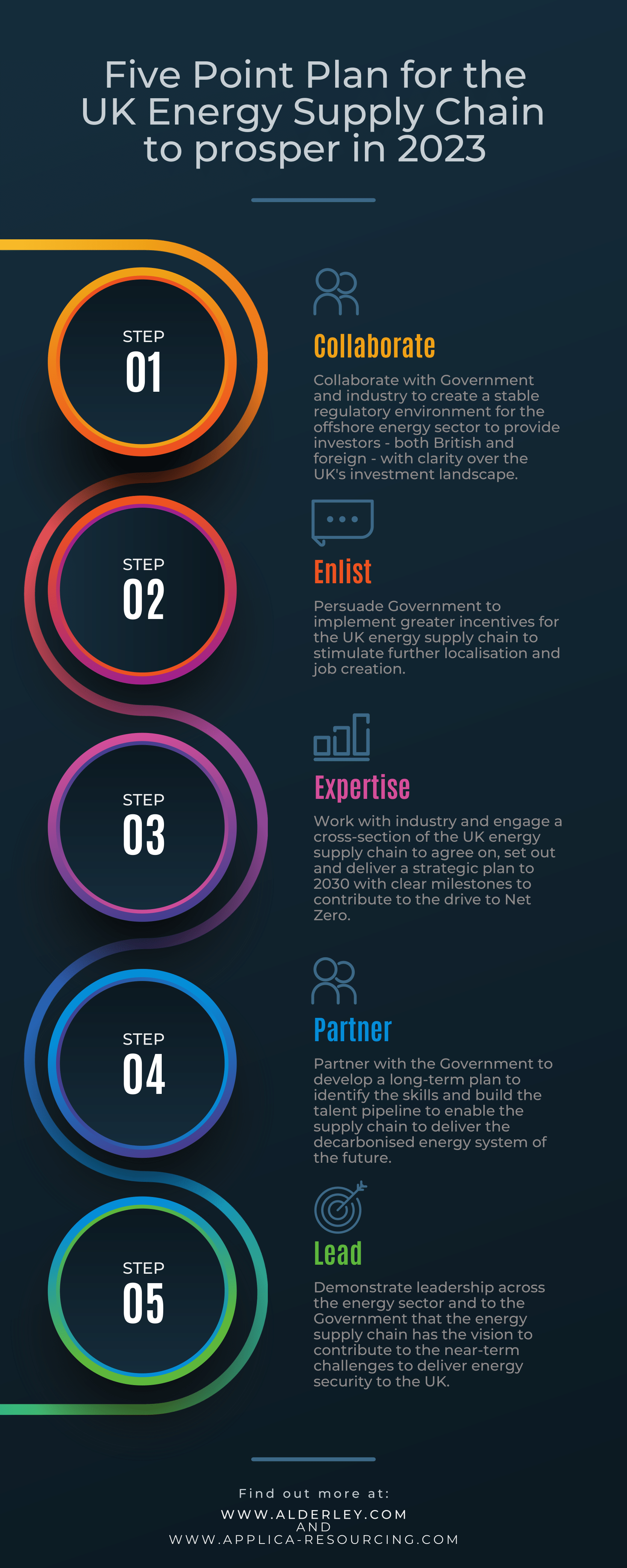 Leading energy solutions provider Alderley and resourcing specialists Applica have today published a Five Point Plan for the UK Energy Industry Supply Chain that calls for greater collaboration between Government and industry, further incentives for localisation and job creation as well as clear articulation of the milestones that the supply chain and energy industry as a whole must take to contribute to Net Zero.  The Five Point Plan also calls for greater focus on developing the skills and talent pipeline to enable the future decarbonised energy system.